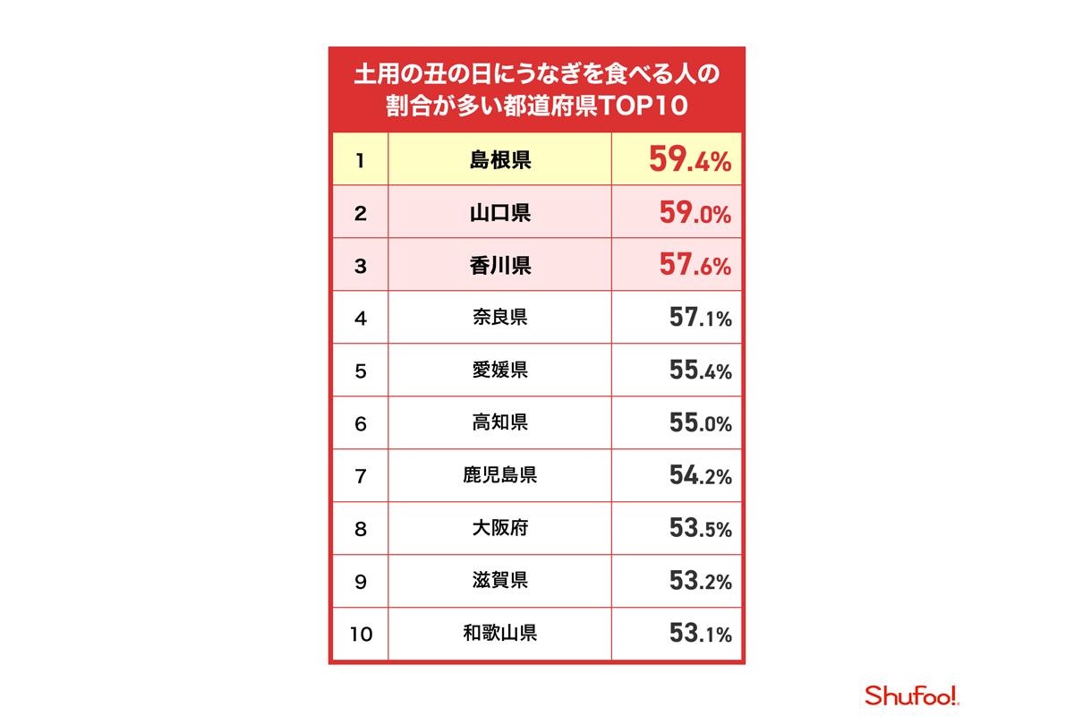 「うなぎを食べる」と回答した人の割合を都道府県別に見ると、「うなぎ街道」を有するなど古くから食文化としてうなぎが根付いている島根県が1位(59.4%)に。2位は山口県、3位に香川県と続き、トップ10全てを西日本の府県が独占した。