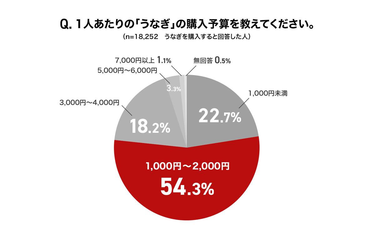1人あたりの購入予算は「1000~2000円」が54.3%と過半数を占め、ついで「1000円未満」が22.7%、「3000~4000円」の18.2%という順に。購入予定の「うなぎ料理」は「長焼き」が33.7%と、ポピュラーな「うな重」の33.6%を若干上回る結果になった。うな重よりもうなぎの量が少なめとされる「うな丼」は24.8%で3位に。細切りにしたうなぎをごはんと混ぜて食べる名古屋名物の「ひつまぶし」は7.6%と、「串焼き」の7.7%と肩を並べた。