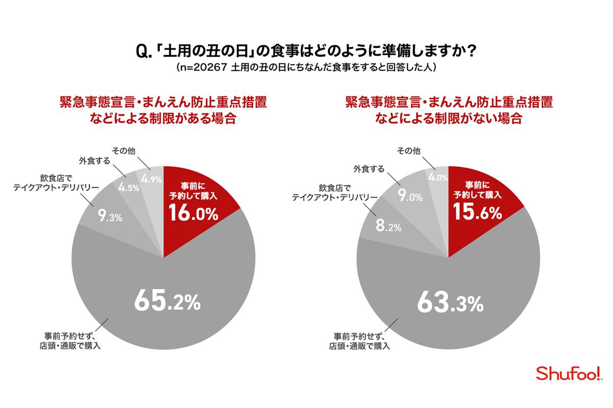 今年の「土用の丑の日」は7月28日。うなぎを食べる場所は、94.5%が「自宅」と回答。新型コロナウイルス感染症拡大を防ぐ緊急事態宣言や蔓延(まんえん)防止等重点措置の制限がある場合とない場合でも、事前に予約して購入するとした人は、「制限あり」が16.0%、「制限なし」は15.6%と拮抗(きっこう)した。いずれにしても、うなぎを予約をして購入する人は少数派だった。