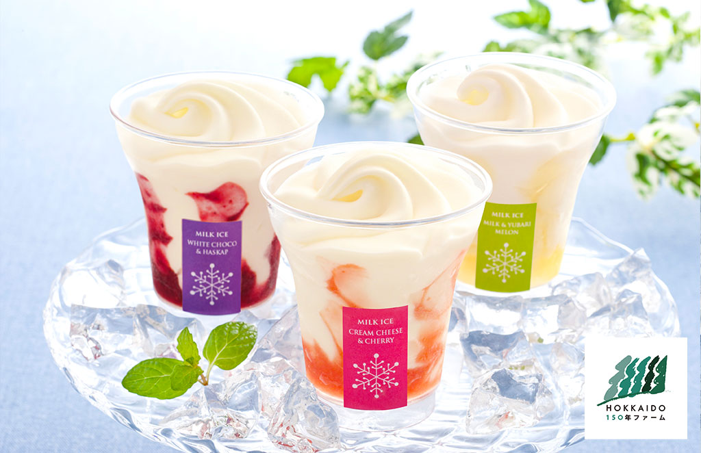 夕張メロン、さくらんぼ、ハスカップのソースがアイスの風味を引き立てるミルクとフルーツの相性をお楽しみいただけます。北海道150年ファーム 札幌ミルクアイス(7個入)を、税込み4,320円(送料500円、軽減税率対象)で販売します。