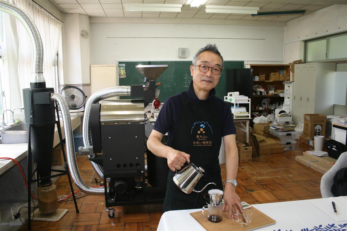 校舎1階の元理科室に焙煎機を持ち込み、水洗いから焙煎、出荷まで1人で仕事をこなすが、利点は水もガスも最初からそろっていたこと。セミの声、カエルの鳴き声、植物の実り…峠越えの通勤路では自然に囲まれて生きていることを実感し、「毎日が幸せいっぱい」という。