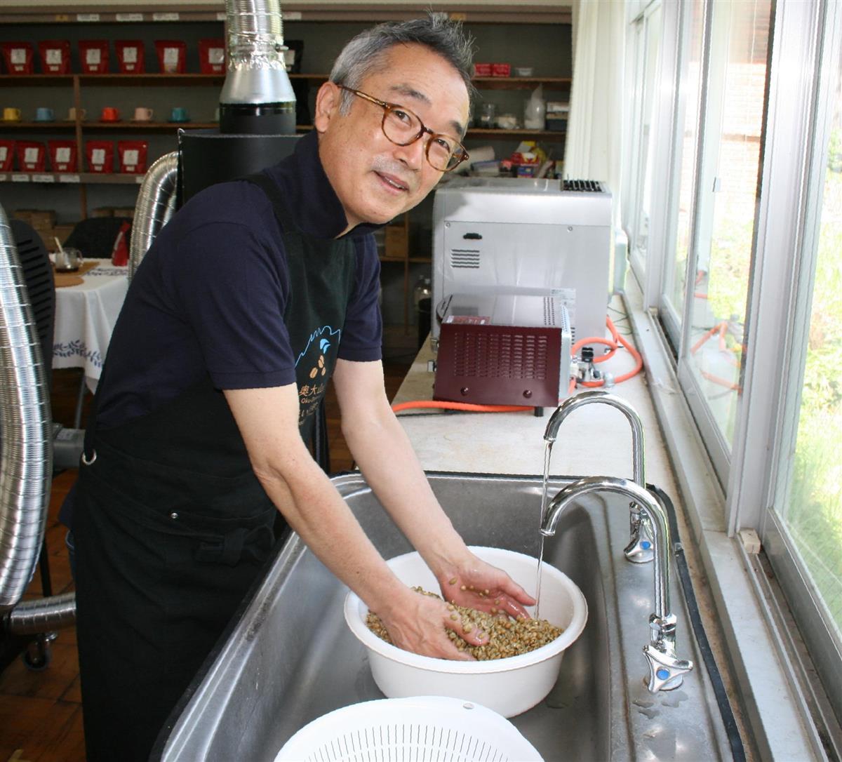 作業は、黄土色をした生豆を洗いおけに入れて大山の伏流水を使った地元の水で洗う。両手で拝むように丁寧に洗うと、透明な水が泥色に染まる。洗った豆をざるに受け、再び洗いおけに入れて洗う。