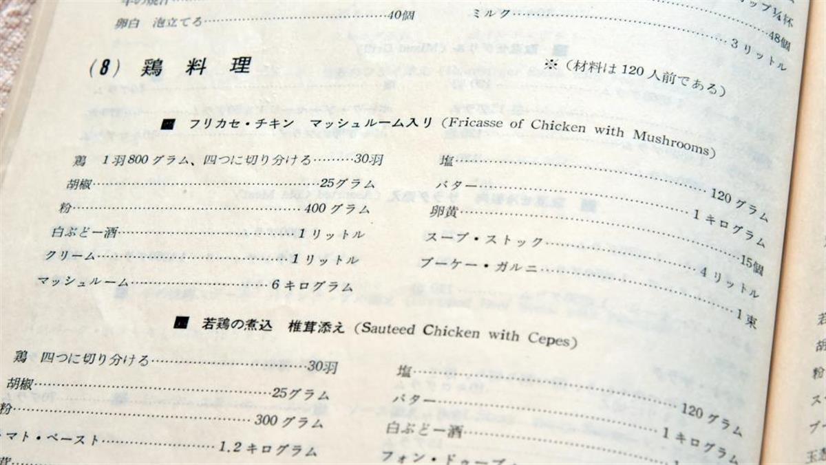 レシピ集に記載されている分量は120人前。ホテルの宴会用のレシピをアレンジしたという。大量の食事を提供するため、効率化を図ったことが分かる。