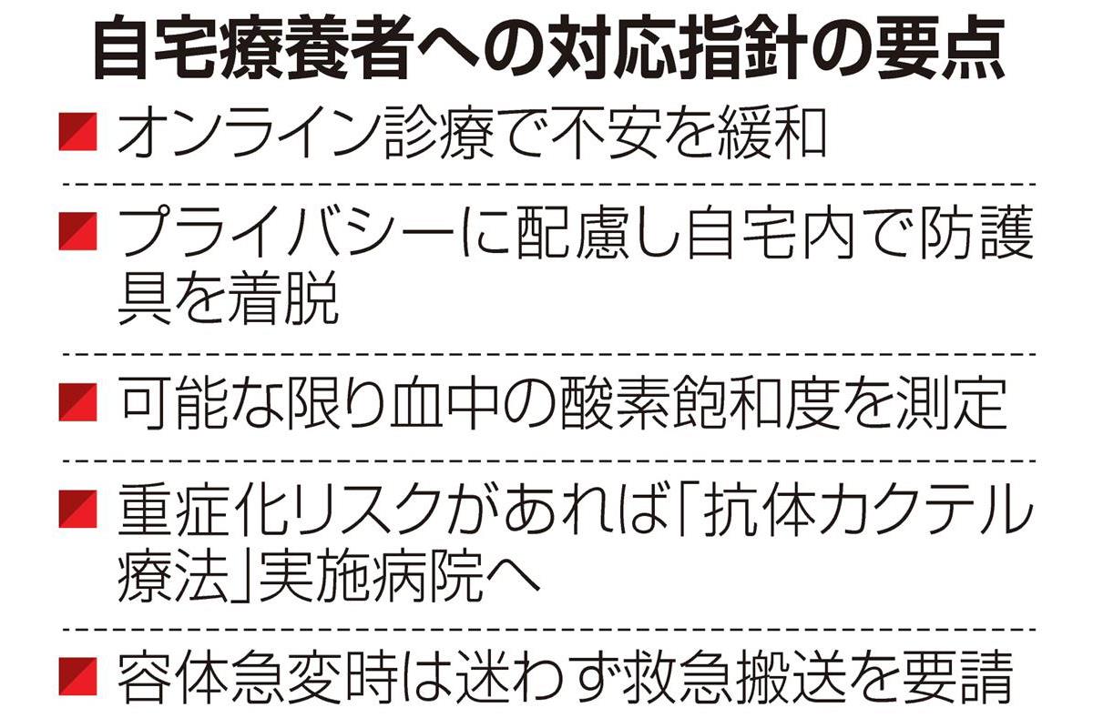 大阪府医師会は27日、新型コロナウイルスの自宅療養者を診療する医師向けに指針をまとめ、公表した。往診前に自覚症状などを聞き取り、症状悪化の兆候が表れやすい血中の酸素飽和度に注意することなどを明記。重症化リスクがある患者は治療薬の「抗体カクテル療法」を行う病院に迅速に入院させることも盛り込んだ。