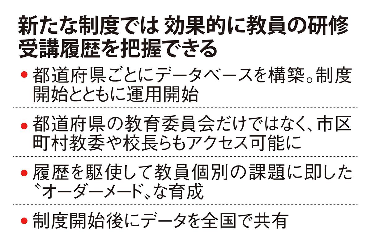 新たなデータベースはまず、新制度開始にあわせて都道府県教委ごとに整備する。市区町村教委に加え、校長や教頭といった各学校の管理職もアクセス可能にする方向で調整していく。特に校長らが個別の受講状況を把握することで、各教員の長所を伸ばし弱点を補強する“オーダーメード”な育成を進めることを視野に入れている。