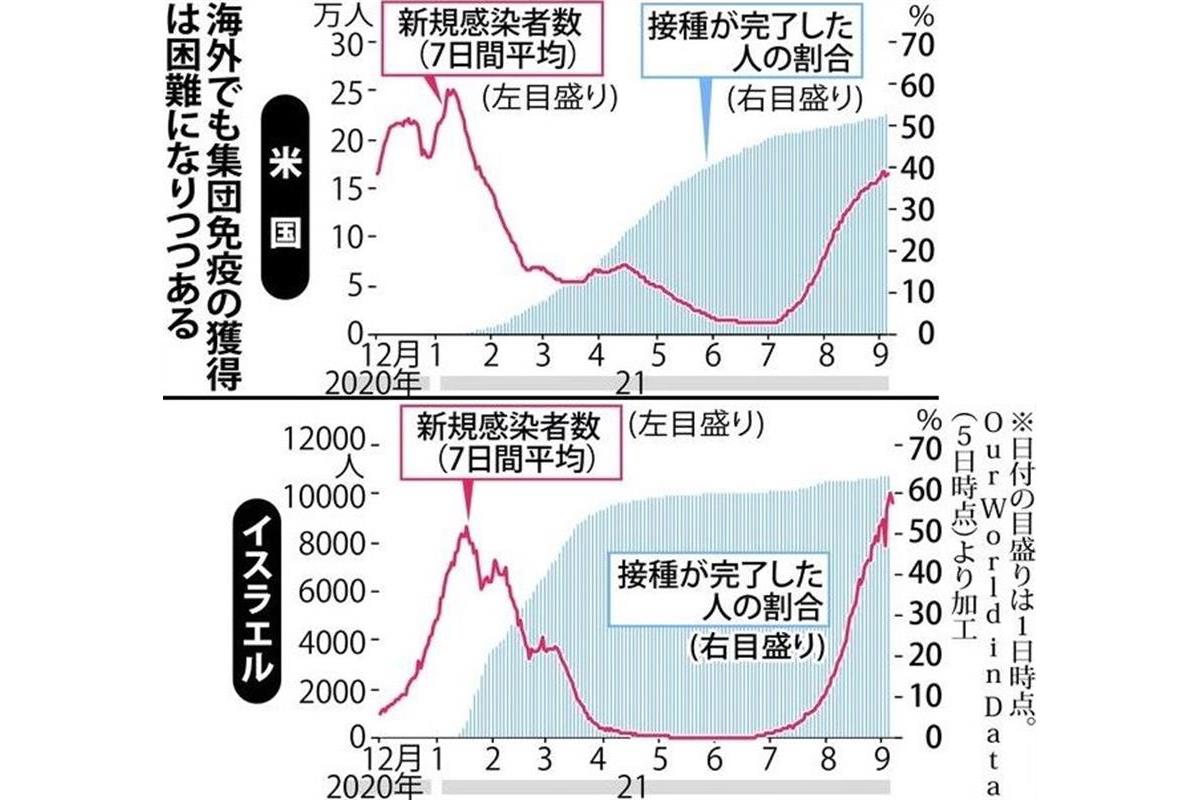 悲観的な見方の背景にはワクチン接種が進む海外での感染拡大がある。国内で2回接種を終えたのは現状で5割弱だが、接種率が約6割のイスラエル、約5割の米国でも感染者は増加の一途をたどる。その中でイスラエルなどは3回目を接種する「ブースター」を開始しており、日本政府もその効果を注視している。