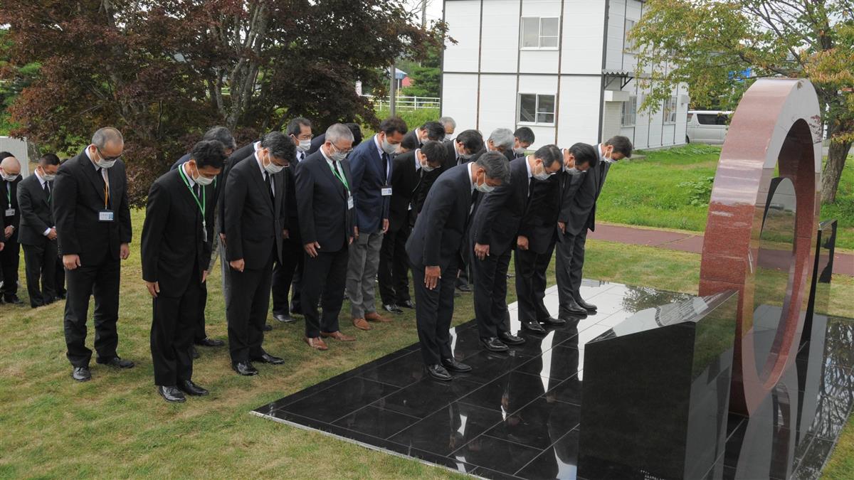 職員らは前日に除幕式が行われた役場敷地内の慰霊碑前に喪服姿で整列。正午のサイレンとともに約30秒間、犠牲になった町民の名前が刻まれた慰霊碑に向かって静かに黙祷(もくとう)した。