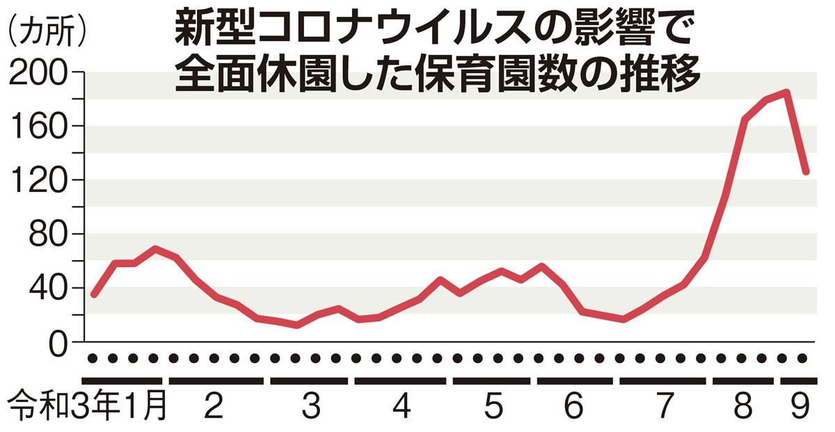 子供への感染が広がっている新型コロナウイルスの感染「第5波」で保育所の休園が相次いでいる。厚生労働省によると、9日時点で少なくとも全国16都道府県で126カ所が休園。前週から59カ所減ったが、第5波当初の6月下旬と比べると約6倍に増えており、予断は許されない。子供の世話のために保護者が仕事を休まざるを得ないケースもあり、国や企業による支援が求められる。(永井大輔)