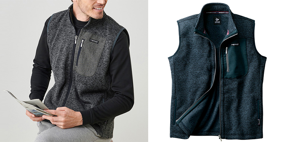 「ダンロップ・リファインド 家でも外でも軽量ニットフリースベスト」(4,389円)は、杢調のやわらかなフリース素材の前開きベストです。衿後ろのロゴ刺しゅうや、胸ポケットの切り替えデザインなど、さりげないこだわりを感じるデザイン。