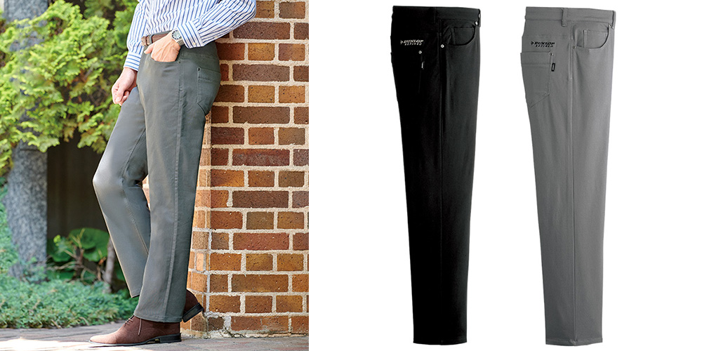 「ダンロップ・リファインド 伸びて暖か毎日はきたいチノパンツ 2色組」(8,789円)は、驚くほどストレッチが効いた素材で動きやすいチノパンツです。しゃがんだり、長時間のデスクワークをしていても窮屈感を感じにくく、快適なはき心地です。ウエストもまるでゴム仕様と思うほどよく伸びるので楽らく。裏面はソフトな起毛素材になっているので寒くなるこれからの季節にぴったりです。