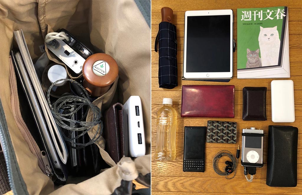 収納面も、ご覧の通り、予想以上の収納力でした。この日は、出勤用のバッグに入っていたものをそのまま移動してみました。中身は週刊誌、iPad、折り畳み傘、モバイル用充電器、定期入れ、システム手帳、長財布、iPodクラシック(イヤホンも)、スマートフォン、ペットボトル(500ミリリットル)。入れる前は、ちょっと多いかなと思いましたが、整理整頓して入れれば、まだ少し余裕がある感じでした。