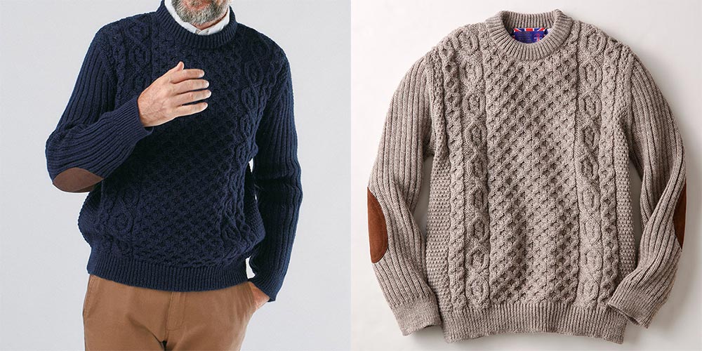 ケーブル編みを施したクルーネックのセーター。アラン模様の凹凸の陰影が美しく、温もりあふれる仕上がりになっています。こちらもエルボー部分にはスエードのパッチ付きで、摩耗しやすい部分を守ります。