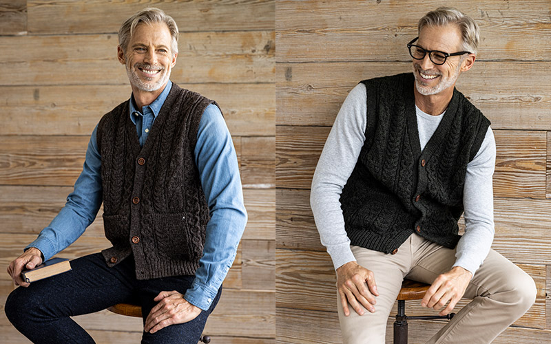 中央の木ボタンが、ざっくりとした風合いを引き締め、デザイン性を高めているベスト。前身頃には便利なオープンポケット付き。寒い時期にはジャケットの下に合わせることもでき、初秋から冬の終わりまで幅広く活躍するアイテムです。ネイビーとベージュにブラウンとグリーンが加わり4色展開となりました。