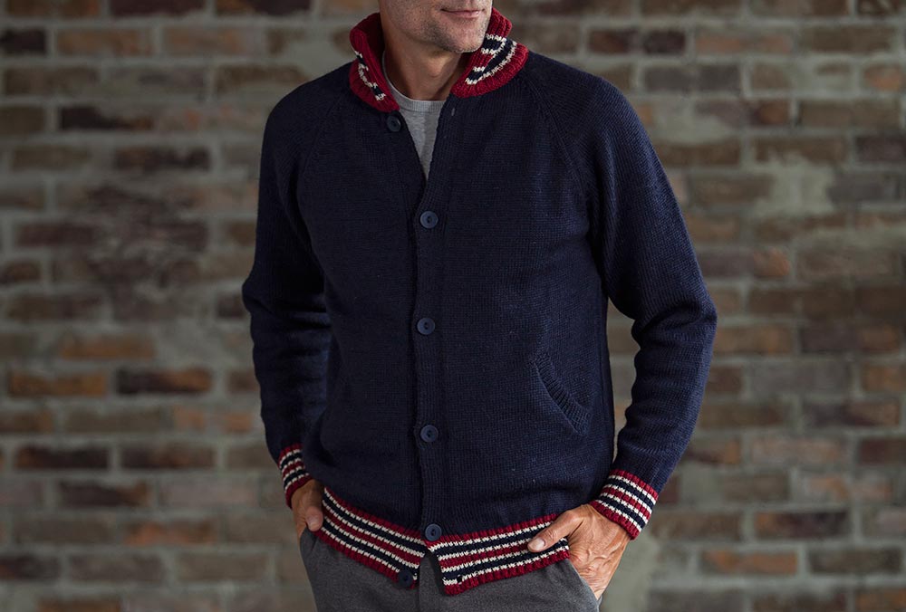 肩周りに余裕があり、動きやすいラグランスリーブを採用。一般的にスタジャンはメルトンなど目の詰まった生地が多いですが、ニットにして温かくも柔らかく、動きやすいスタジャンを実現しました。襟や袖口、裾周りのライン柄がワンポイント。ポケット付きでアウターとしての着用にも適しています。
