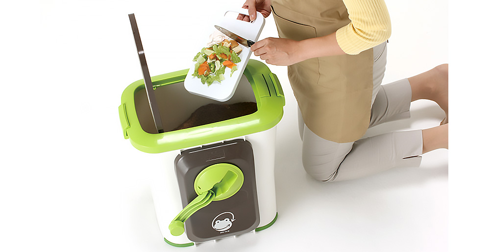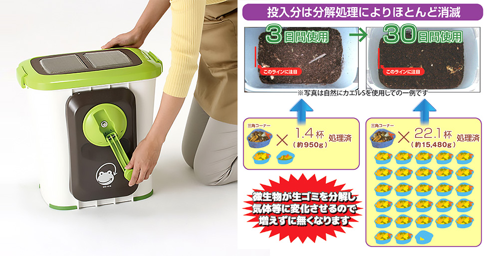 「自然にカエルS」は軽くて回しやすく、かくはんが効率よくできるように改良が重ねられたかくはん羽根を採用。女性でも簡単に回せるつくりになっており、効率的な生ごみ処理を家庭で手軽に行えます。