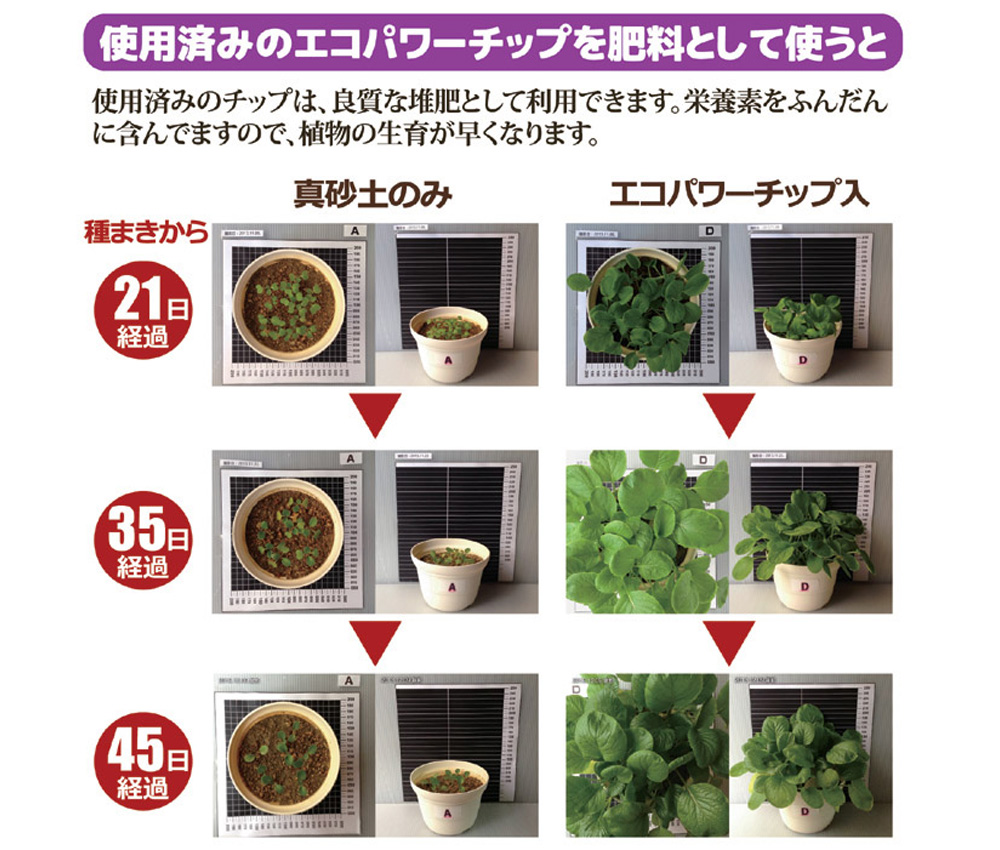 使用済みのチップは良質な有機肥料になり、園芸用の土に混ぜこんだり、花壇に撒いて再利用できます。栄養価がかなり高いので、植物の生育が早くなります。また、肥料に利用しない場合は燃えるごみとしても処理できます。