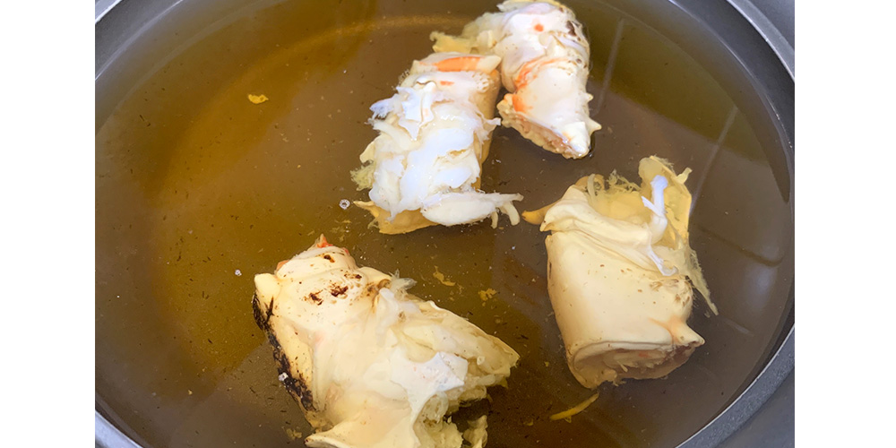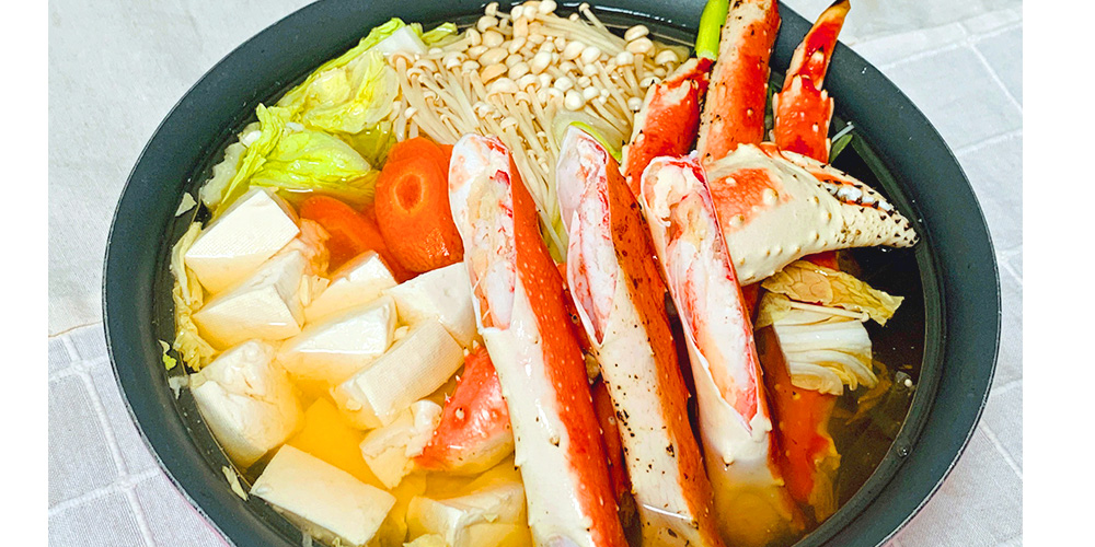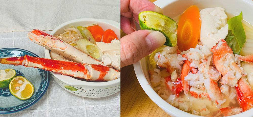 翌日も“タラバ祭り”は続きます。この日は解凍した肩付き脚でカニ鍋を調理。脚を動かす肩肉は筋肉質で、食感がプリプリとしており、旨味がギュッとつまった部位です。これを出汁としてスープに浸します。ほかにも昆布、酒、みりん、しょう油を投入して味付け。