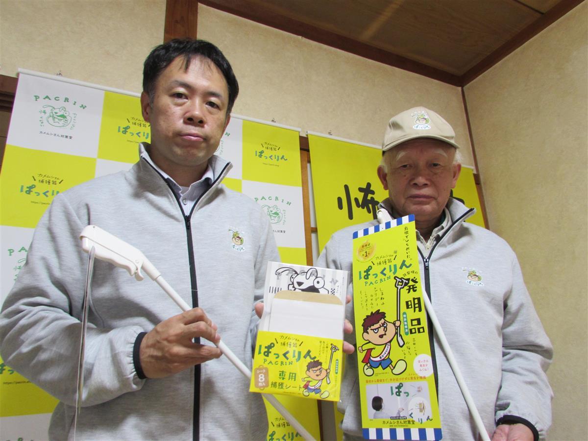 ヒントは、8年前に知人の口から出た「マジックハンド」というキーワードだった。マジックハンドのような器具の先に粘着シートをセットすれば、床はもちろん、壁や天井にいるカメムシでも押し付けてシートにひっつけ、捕獲できるのではないか。父親で浜村木材社長の雅男さん(72)の協力も得て試作品作りを重ねた。
