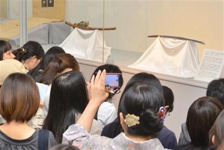 京極家伝来の名刀「ニッカリ青江」を鑑賞する大勢の「刀女子」ら=香川県丸亀市