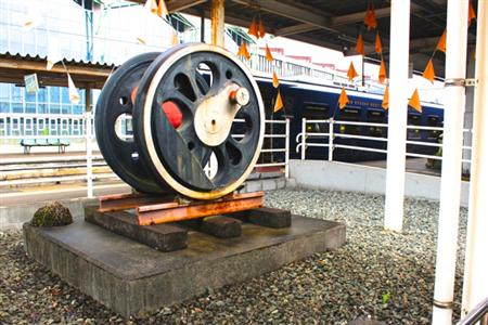古い車輪と線路をデザインしたオブジェ