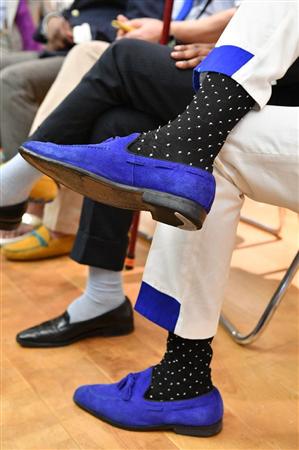 「サプール」カンガ・エリックさんの足下=大阪市中央区の大丸心斎橋店(南雲都撮影)