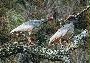 求愛の擬交尾をする7歳雄(上)と6歳雌のトキ。雑木林の枯れ枝に鮮やかなとき色の羽が浮かび上がった=新潟県佐渡市(キヤノンEOS-1DXMarkIIEF800mm1/800、f5.6、ISO640)