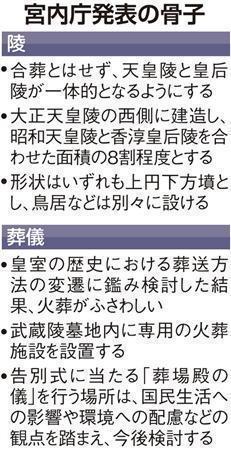 宮内庁は11月14日、天皇、皇后両陛下のご意向で検討していた陵のあり方と葬送方法の変更を、概要にまとめて公表した。江戸時代前期から行われてきた天皇と皇后の土葬を改め、火葬とすることなどが盛り込まれた。天皇陵と皇后陵を同一にする合葬(がっそう)は見送られた。同じ敷地にそれぞれの墳丘を造り、敷地規模をこれまでより小さくすることで、両陛下が望まれる簡素化を図る。検討内容はすでに内閣に報告されており、約350年ぶりに土葬の伝統が変わることになった。