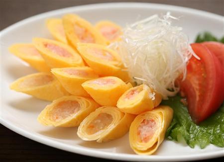 ふんわりした卵焼きの食感と大根とニンジンのサクサクした歯応えがマッチ。脇には大葉の上にトマトが載せられ、黄、赤、緑…と彩りも見た目を楽しませてくれる。