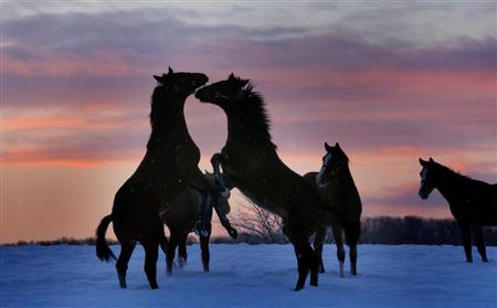 今年は午年。白銀の世界になった北海道安平(あびら)町の馬生産牧場「追分ファーム」では、昨年生まれたサラブレッドの子馬たちが、寒さをものともせず躍動していた。