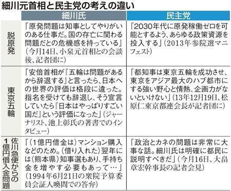 東京都知事選(1月23日告示、2月9日投開票)への出馬を決めた細川護煕(もりひろ)元首相(76)は1月16日、公約を発表する17日の記者会見を20日以降に再延期すると発表した。「脱原発」や2020年東京五輪の対応で過去の自身の発言と自主的に支援する民主党などとの整合性が取れない上、東京佐川急便からの1億円借り入れ問題の説明の仕方に苦慮しているとみられる。