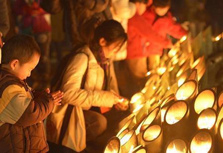 兵庫県神戸市中央区の東遊園地で行われた「1・17のつどい」でろうそくに向かい手を合わせる子供=2014年1月17日早朝(土井繁孝撮影)【拡大】