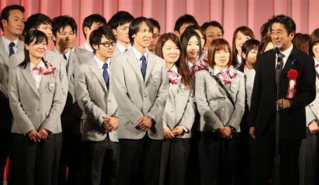 結団式に続いて行われた壮行会で、安倍晋三(しんぞう)首相(右端)に激励される葛西紀明主将(中央)、田畑真紀副将(左端)ら、ソチ冬季五輪日本選手団の選手たち=2014年1月20日、東京都港区のグランドプリンスホテル新高輪(小倉元司撮影)【拡大】