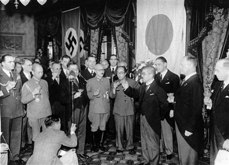 1940(昭和15)年9月27日、東京・麹町の外相官邸で開かれた「日独伊三国同盟」締結祝賀会に臨んだ東條英機陸相(当時、軍靴姿の中央)。同盟は同盟として、一方で東條はユダヤ人の痛みに情けをかけていた。乾杯の音頭を取っているのは松岡洋右外相【拡大】
