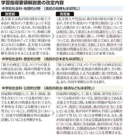 改定した解説書は中学校社会科の地理、歴史、公民の各分野と、高校の日本史A・B、地理A・B、現代社会、政治・経済-で、尖閣諸島と竹島を「固有の領土」と明記。