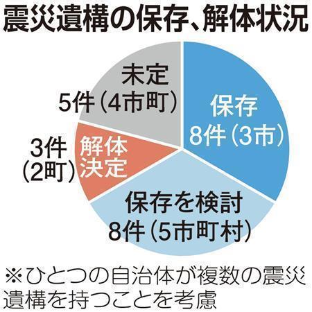 東日本大震災の津波で破壊され、被災の記憶や教訓を伝える「震災遺構」が岩手、宮城、福島3県の13市町村で24件あり、このうち8市町村の16件で保存が決定したか、保存の方向で検討していることが3月6日、産経新聞の調査で分かった。保存の理由として自治体の大半は「震災を語り継ぎ、防災意識を醸成するため」としている。