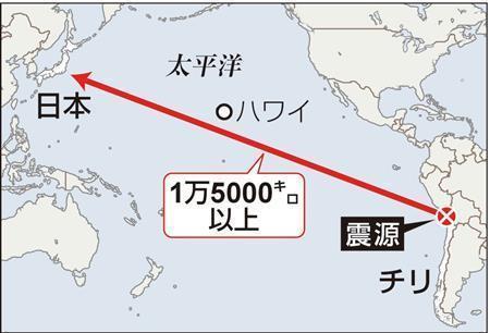 チリ北部沖で4月2日(日本時間)に起きたマグニチュード(M)8.2の地震で、3日午前から午後にかけて北海道から関東の沿岸、伊豆諸島、小笠原諸島に津波が到達した。気象庁は3日午前3時に津波注意報を発表、岩手県久慈市で60センチ、北海道えりも町と茨城県大洗町で30センチ、仙台市などで20センチを観測したが、3日午後6時に解除した。