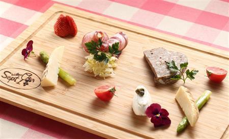 木製のプレートに美しく盛りつけられた「前菜の盛り合わせ」は食欲をかき立ててくれる。京都・塚原の農家から仕入れた朝掘りタケノコとアスパラの野菜の組み合わせ。焦げ目のついたタケノコには余分な味付けがなく、逆にアスパラはちょっぴり塩味でバランスがいい。イタリア産ハムもほんのり塩味でワインに合いそうだ。また、地元・京都産の豚肉と鶏のレバーをテリーヌ風に仕立てた「パテ・ド・カンパーニュ」も味わい深い。一通りの味覚散歩を楽しんだ後は、イチゴやミニトマトが舌を“リセット”してくれる。