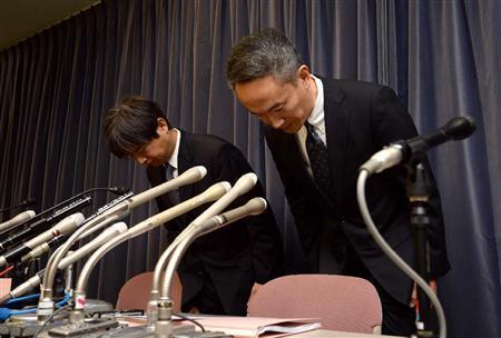 那覇空港での重大インシデントについて会見の冒頭で謝罪をする、ピーチ・アビエーションの遠藤哲・総合企画部長(右)と運航基準課の舩井康伸課長=2014年4月30日午前、東京都千代田区(大橋純人撮影)【拡大】