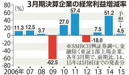 東京証券取引所に上場する企業の2014年3月期決算発表が5月9日、ピークを迎えた。東証1部上場企業(金融を除く)の業績は安倍晋三政権の経済政策「アベノミクス」による円安株高などを追い風に、最終利益は2.1倍に膨らんだ。ただ、15年3月期は5.1%増と伸びが大幅に鈍化する見通し。今後大幅な円安が見込みづらいほか、4月からの消費税増税の影響も見極めにくく、各社とも先行きに慎重な姿勢をみせている。