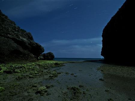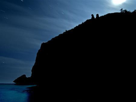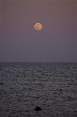 夏至の日、黄昏時のヤハラヅカサの海の向こうに現れたスーパーフルムーン。太陽の光を照り返し、いつもより一段と大きく見える。石碑は満潮時には水面に隠れ、干潮時には全貌を現す。向こうに久高島も見える=2013年6月23日、沖縄県南城市(井浦新さん撮影)【拡大】
