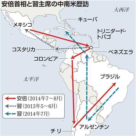 中南米の伝統的な親日国を歴訪中の安倍晋三首相(59)は、経済協力を深めて成長市場を取り込み、各国との連携を通じて中南米地域や国際社会での日本の影響力拡大も狙う。ただ、中南米では中国も進出に積極的だ。米国の「裏庭」で繰り広げる日中の勢力争いは“オセロゲーム”のように激しさを増している。