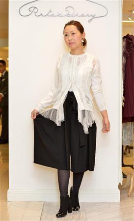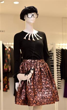 ケイト_スペード_ニューヨークの赤いニット(2万5000円)に毛足のあるウール素材のベージュのスカート(4万5000円)をあわせてシックに=2014年9月1日、東京都中央区(宮崎瑞穂撮影)。※価格はすべて税別です【拡大】
