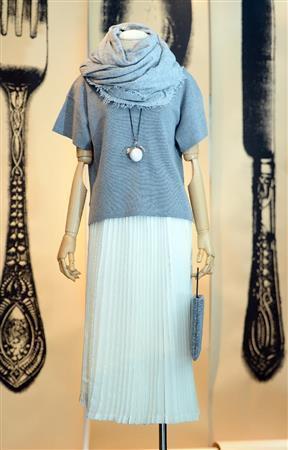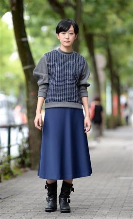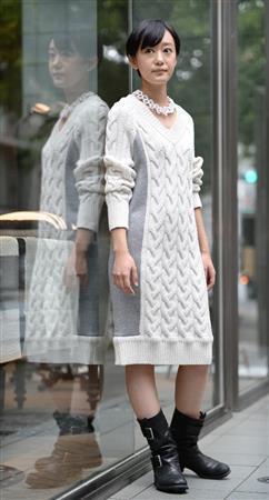 ナイロンニットとボンディングジャージーを組み合わせたケーブル網のドレス(3万円)。エンジニアブーツを合わせスポーティーに。ホワイトとライトグレーは今年のテーマカラーの一つ。※価格はすべて税別です=2014年9月4日、東京都港区(寺河内美奈撮影)【拡大】