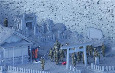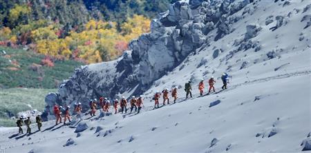 山頂付近にある神社や山小屋の周囲を集中的に捜索。グリーンの迷彩服の自衛隊員、警察官は薄ブルーと黄色の出動服姿だった。それぞれがヘルメットと白いマスクを着用し、かがみ込んで灰を掘ったり、救助した人を毛布にくるみ、担架に乗せていたりする光景が見られた。
