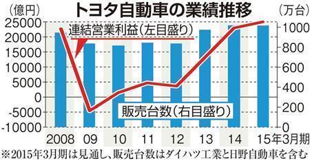 トヨタ自動車の業績推移=2008年~2015年3月期。※2015年3月期は見通し、販売台数はダイハツ工業と日野自動車を含む【拡大】
