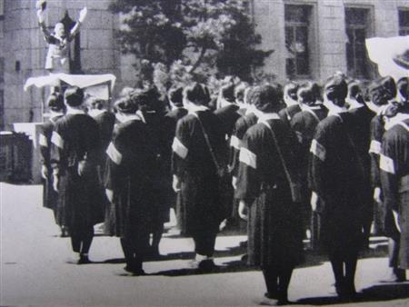 日中戦争の最中、万歳に送られて中国戦線に赴く従軍看護婦たち。その源流は第一次世界大戦時に欧州に派遣され、現地で激賞された「救護看護婦」だった=「明治100年の歴史」(講談社、提供写真)【拡大】