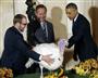 米ホワイトハウスで行われた「七面鳥恩赦式」で話すバラク・オバマ米大統領(左)と長女のマリアさん(右)、次女サーシャさん(中央)=2014年11月26日、米国・首都ワシントン(AP)【拡大】
