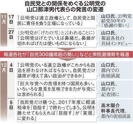 報道各社が衆院選序盤情勢調査で自民党の圧倒的優勢を伝えたことを受け、公明党は与党内の発言が弱まりかねないとして警戒を強めている。2017(平成29)年4月の消費税再増税の際には生活必需品の消費税率を低く抑える軽減税率の導入を確実にし、来年の通常国会で予定される安全保障法制をめぐる審議では安倍晋三政権の「ブレーキ役」を果たしたいところ。自民党にも選挙戦の自公連携に影響しかねないとの懸念が生じている。