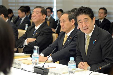 閣僚と有識者による「まち・ひと・しごと創生会議」であいさつする安倍晋三(しんぞう)首相(右)。政府の経済対策もまとまり、いよいよ「刺激から目配り」へ、アベノミクスの第2章が始る=2014年12月26日午前、首相官邸(酒巻俊介撮影)【拡大】