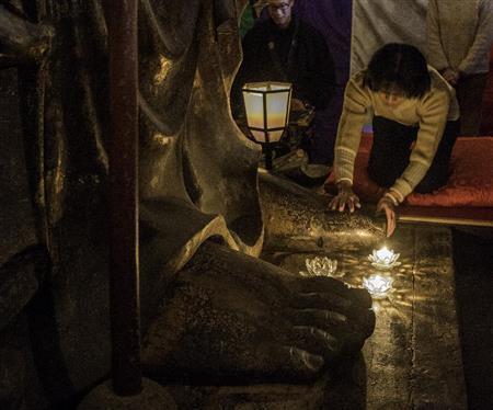 雨はもうほとんどやんでいるのだが、境内の石畳はうっすらと濡れていた。三々五々、訪れた人たちは山門をくぐると左側の緩やかな坂道を上がっていく。僧堂で除夜の鐘を突くことができるからだ。